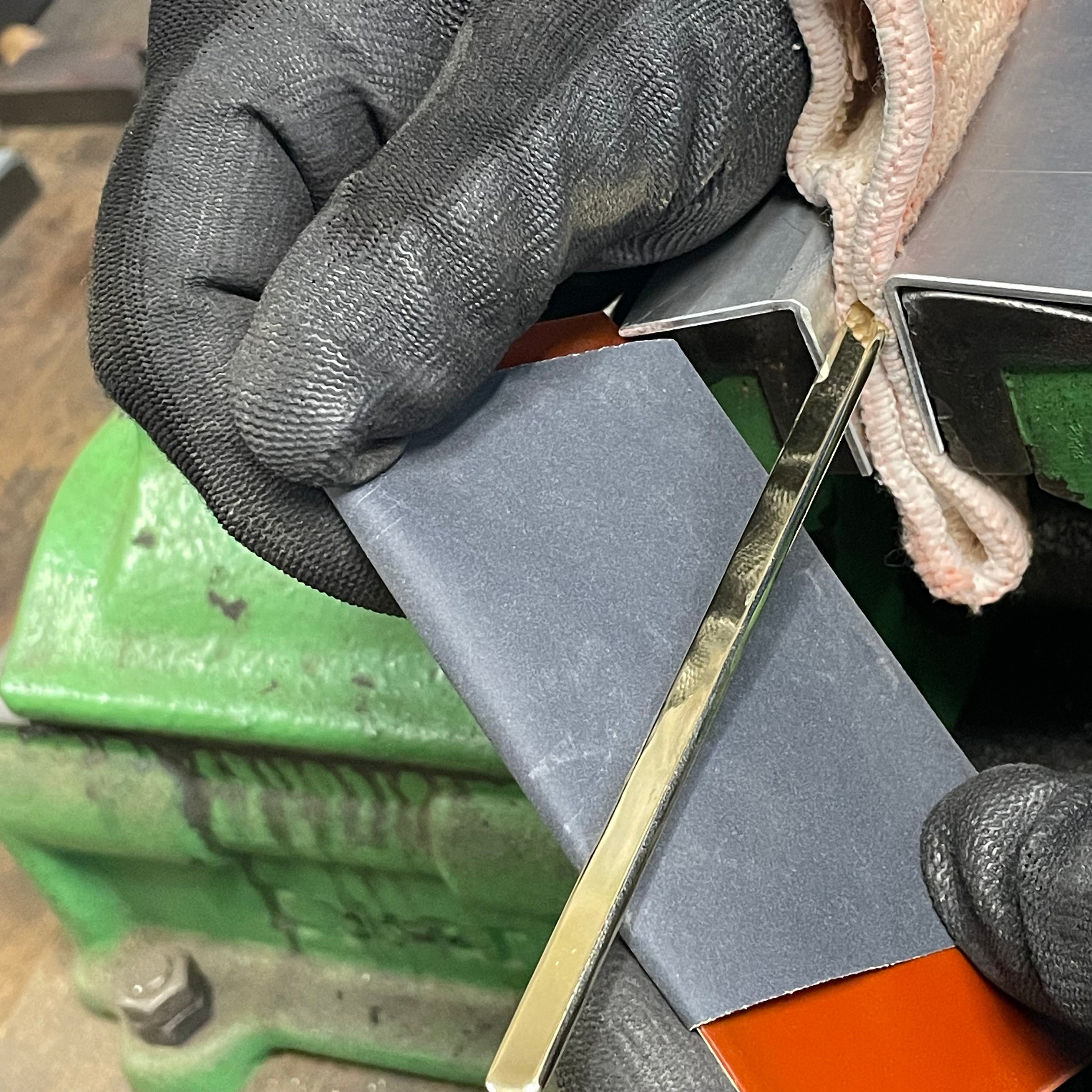 Viele seiner Maschinen hat er selbst entworfen und gebaut, und seine Techniken stetig verfeinert. Die Fotos zeigen verschiedene Stationen des kreativen Prozesses. Vom Zuschnitt über das Sägen, Schleifen und Formen bis hin zu Schmiedearbeiten.