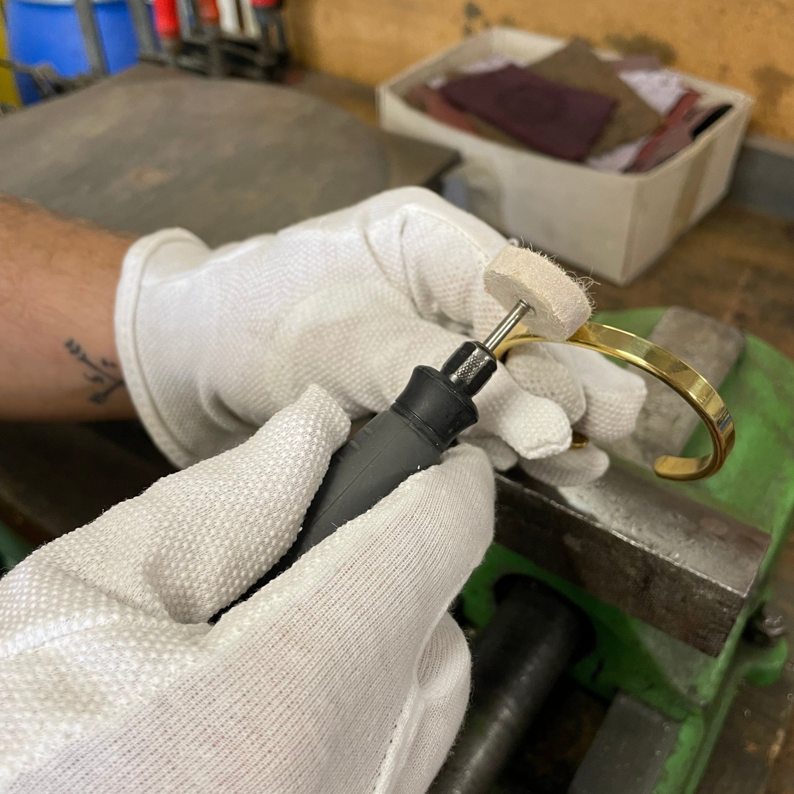Mit großer Sorgfalt fertig er jedes Schmuckstück von Hand. Für’s Polieren nimmt er sich gerne besonders viel Zeit